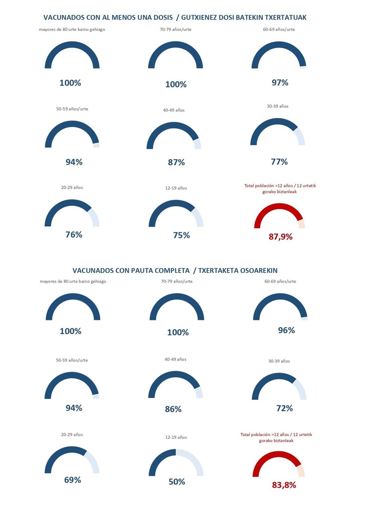En cuanto a la cobertura por grupos de edad, se ha administrado la pauta completa al 100% de mayores de 80 años y al mismo porcentaje de los de 70 a 79 años. Además, tienen la pauta completa el 96% de los de 60 a 69 años; el 94% de los de 50 a 59 años; el 86% de 40 a 49 años; el 72% de 30 a 39 años; el 69% de 20 a 29 años; y el 50% de 12 a 19 años.