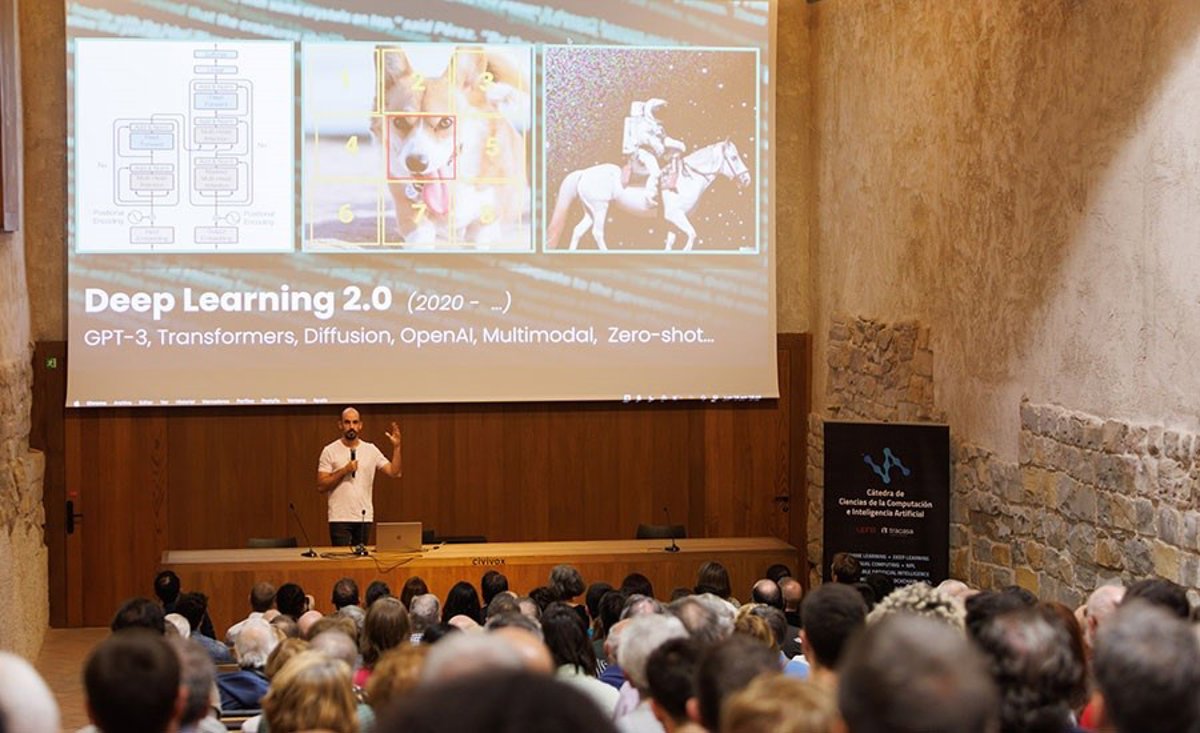 El día 16, la jornada de apertura de la Semana de la IA reunió en el Palacio de Condestable a más de 150 personas, que disfrutaron con la charla divulgativa de DotCSV, uno de los principales divulgadores de inteligencia artificial en redes sociales, que compartió durante una hora su visión de esta tecnología en 'Bienvenidos a la 4 revolución'. Además, Mikel Galar y Carlos Aranda, director y presidente de la Cátedra Tracasa de la UPNA, respectivamente, pudieron explicar el funcionamiento de la cátedra y desgranar las principales líneas de trabajo, en materia de innovación, de las entidades que sustentan la cátedra.