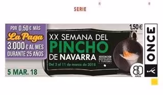 El tradicional cupón de la ONCE dedicará el del 5 de marzo a la XX Semana del Pincho de Navarra. Así 5,5 millones de cupones divulgarán esta fiesta gastronómica de la Comunidad foral. El cupón diario de la ONE ofrece por 1,5 euros 55 premios de 35.000 euros a las cinco cifras. Además, por 0,5 euros más se puede jugar también a la serie, y ganar 'La Paga' de 3.000 euros al mes durante 25 años, que se añadirá al premio de 35.000 euros.