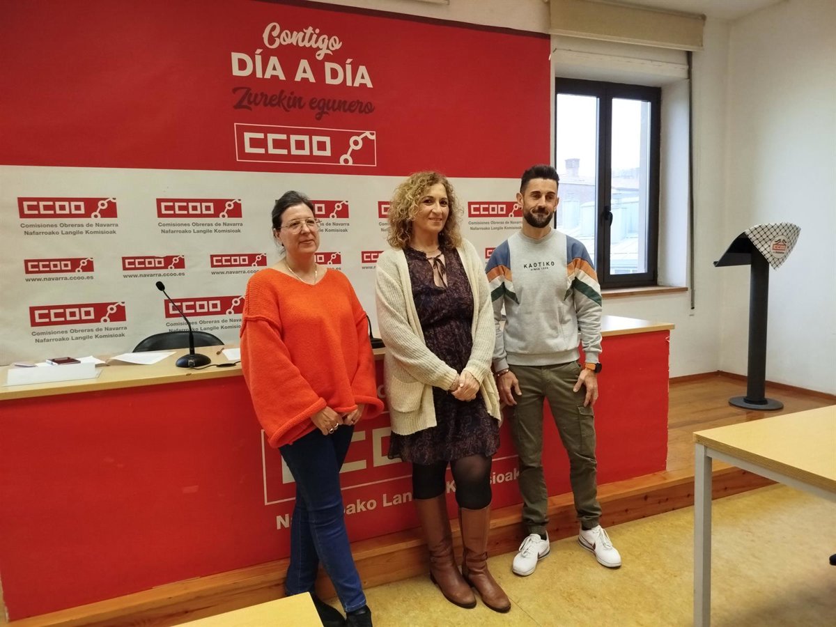 La secretaria general de la Federación de Servicios a la Ciudadanía de CCOO de Navarra, Lucía Sesma, el responsable de Local de FSC de CCOO Navarra, David Rodríguez, y la delegada de CCOO y trabajadora familiar Susana Esparza - EUROPA PRESS