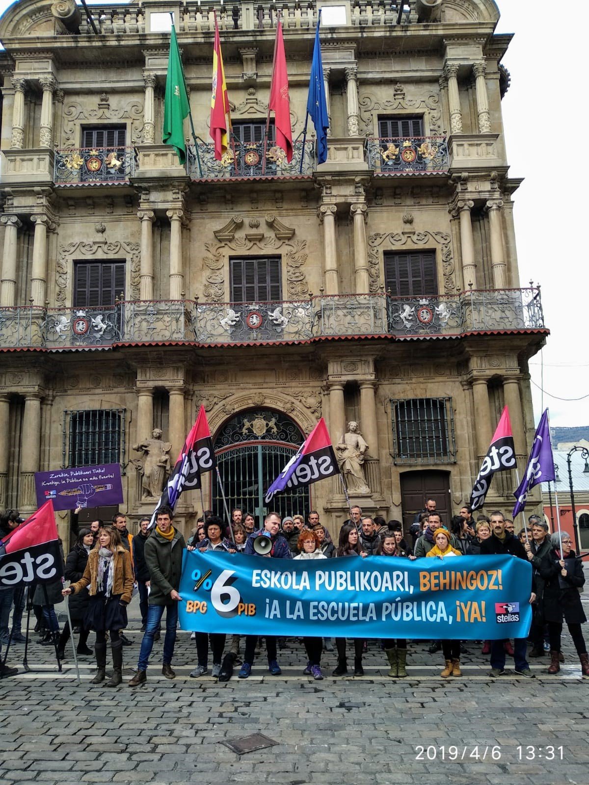 El sindicato ha llevado a cabo este sábado, en la plaza del Ayuntamiento de Pamplona, una concentración con el lema '6% del PIB a la Escuela Pública, ¡Ya!', que ha tenido lugar después de la celebración del Consejo Nacional de Steilas, máximo órgano entre congresos, que se ha celebrado este sábado en el Palacio del Condestable.