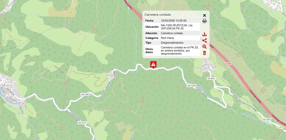 Los servicios de emergencia han recibido el aviso del desprendimiento a las 13.05 horas. El corte de la vía afecta a los municipios de Larraun, Araitz y Betelu.