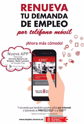El servicio de renovación de la demanda de empleo entró en funcionamiento el 15 de febrero de 2016 a través del teléfono de atención ciudadana del Gobierno de Navarra, 948 012 012 (gratuito) o 012 (coste de 0,34 euros con independencia de la duración de la llamada).