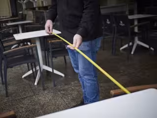Camareros de una terraza de Navarra utilizan un metro para asegurarse de que las medidas de distanciamiento son las correctas entre los potenciales clientes de la terraza de un bar en el centro de Pamplona, Navarra (España), en una imagen de archivo. - Eduardo Sanz - Europa Press - Archivo