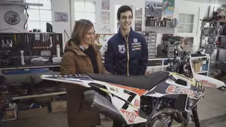 La periodista Paula Fernández y Ander Valentín, campeón de España de motocross en 2019, en el programa Tiramillas de Navarra Televisión dedicado a Ayegui. - NAVARRA TELEVISIÓN
