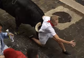 Al inicio de este tramo se ha vivido uno de los momentos de mayor tensión del encierro, cuando un toro castaño que corría por la izquierda ha cogido por el jersey a un mozo y lo ha arrastrado durante varios metros por el suelo hasta que lo ha soltado.