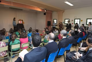Durante la visita, la delegación japonesa ha asistido a una demostración de kamishibai, del cuento 'Elefantito tiene hambre', que ha sido elaborado por los alumnos del centro. El cuento ha sido interpretado en español y japonés por las estudiantes Mitsuki Chimura, de 5º curso, y Leire San Francisco, de 6º curso.