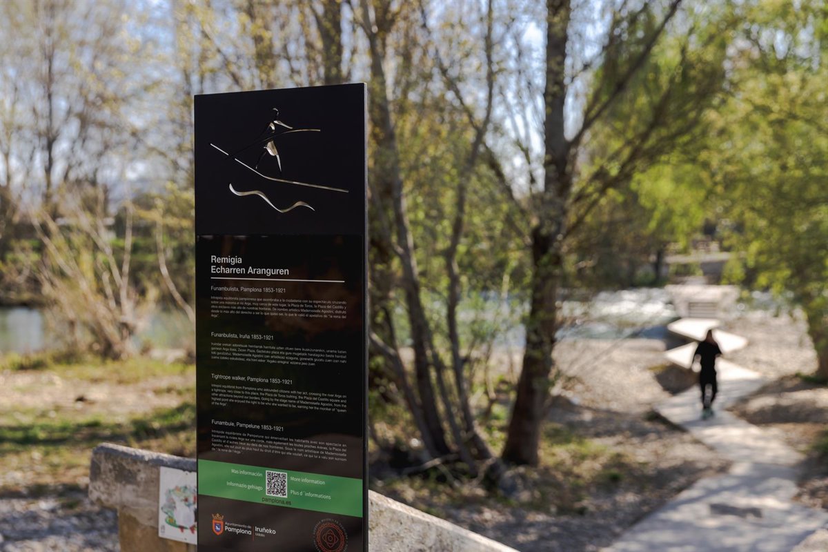 Según ha informado el Consistorio pamplonés en nota de prensa, se ha elegido ese punto como recuerdo de una de las actuaciones "más espectaculares" de Remigia Echarren de las que hay constancia, cuando en los Sanfermines de 1883 cruzó el río Arga a una altura de diez metros frente a la máquina de Pinaquy con unos canastillos en los pies, deshaciendo después el camino con los ojos vendados.