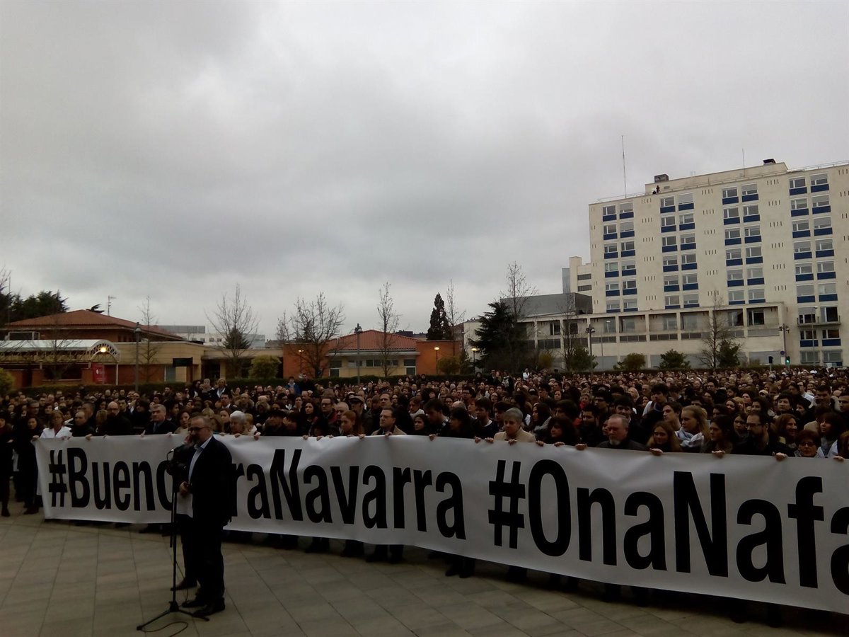La concentración, desarrollada en la explanada del edificio de Ciencias del centro académico en Pamplona, ha dado comienzo sobre las 10.30 horas y los congregados, entre 2.500 y 2.700 según los organizadores, se han reunido tras la pancarta '#Bueno para Navarra #OnaNafarroarentzat'.