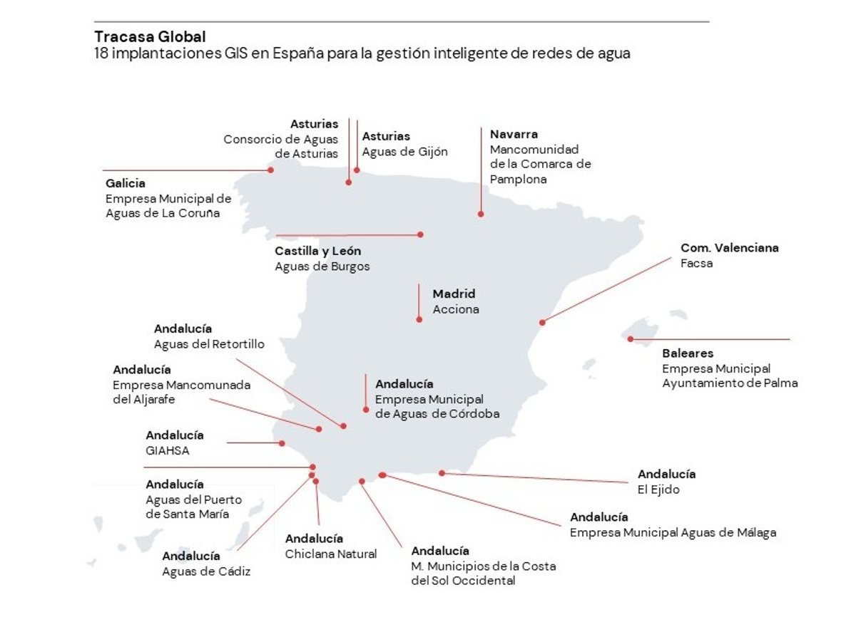 De esta forma, los servicios GIS de Tracasa Global son utilizados por 18 entidades gestoras del ciclo integral del agua en España, que en total dan servicio a más de 9 millones de personas. Se trata de la Mancomunidad de la Comarca de Pamplona, Emalcsa, Consorcio de Aguas de Asturias, Aljarafesa, Aguas de Cádiz, Aguas del Puerto de Santa María, Emasa, Facsa, Aguas de Burgos, Aguas de Gijón, EMAYA, EMACSA, ARECIAR, El Ejido, Acosol, GIAHSA, Acciona (Proyecto DACUA) y Chiclana Natural.