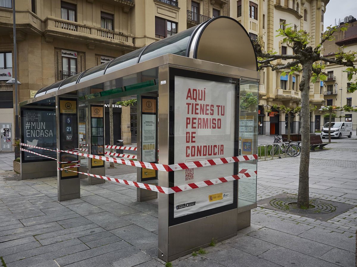 Marquesina de autobús precintada para evitar su uso en el día 47 del estado de alarma, en Pamplona / Navarra (España), a 30 de abril de 2020. - Eduardo Sanz - Europa Press - Archivo