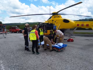 Se han movilizado a los bomberos de Burguete para que trasladaran en ambulancia al afectado desde el centro de salud hasta el lugar donde se encontraba el helicóptero, cerca de la gasolinera de Espinal.