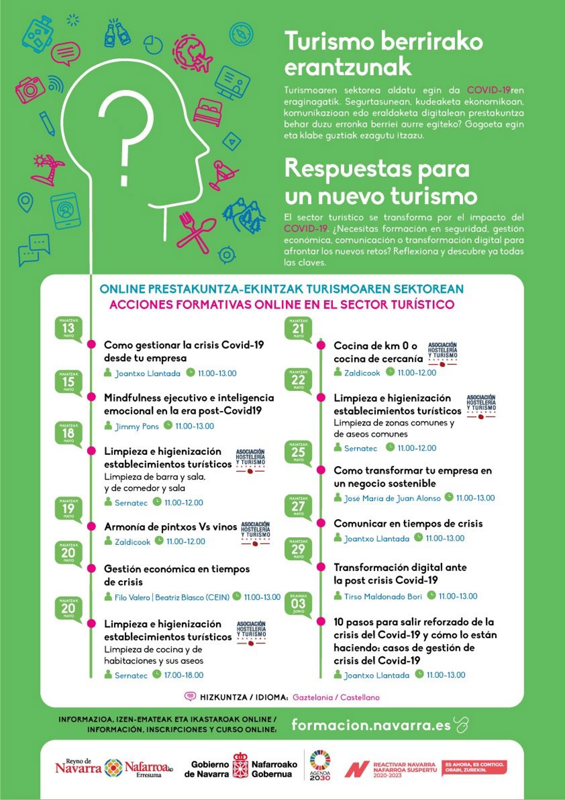 Enmarcado dentro del Plan de Acción 2020-2022 específico contra el COVID-19 y dentro de las medidas a corto plazo, la Dirección General de Turismo, Comercio y Consumo del Gobierno de Navarra ha organizado un total de 12 acciones formativas a través se seminarios web a fin de llegar al mayor número de profesionales posibles. Se trata de una de las acciones fijadas dentro del Plan Reactivar Navarra 2020-2022.