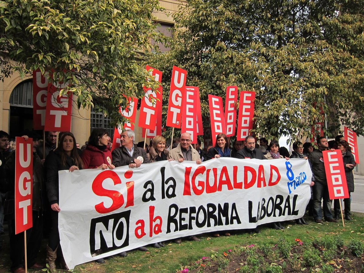 UGT y CCOO se han concentrado este jueves en Pamplona para reivindicar los derechos laborales de las mujeres, que, según han criticado, "se van al traste" con la aprobación de la reforma laboral. Así, los sindicatos han asegurado que esta norma "es un atentando al conjunto de la población trabajadora, pero particularmente a las mujeres".