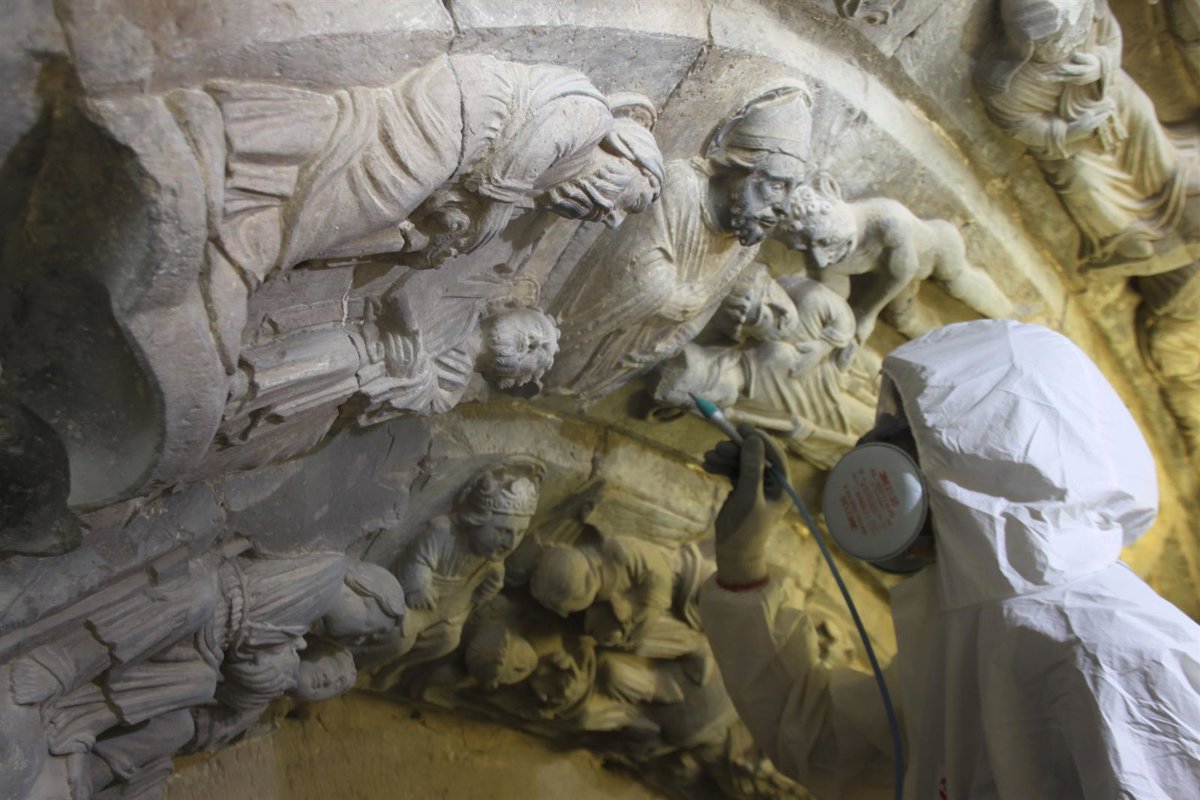 Una vez retirada la suciedad superficial, la limpieza posterior se realizó mediante medios mecánicos muy precisos, como la microproyección controlada de abrasivo suave y limpieza con tecnología láser. Poco a poco se van desvelado las policromías de los rostros de algunas figuras. En las próximas semanas se irán renovando y completando los rejuntes de las dovelas, así como la limpieza final de las figuras, según ha informado el Gobierno.