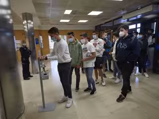 Alumnos de la UPNA se desinfectan las manos en un dispensador de gel hidroalcohólico a su entrada a las instalaciones de la Universidad el día en el que se celebra la apertura del curso 2020-2021, en Pamplona - Eduardo Sanz - Europa Press