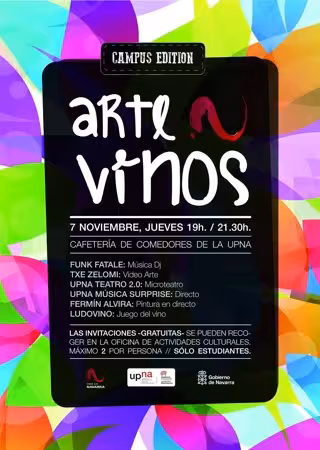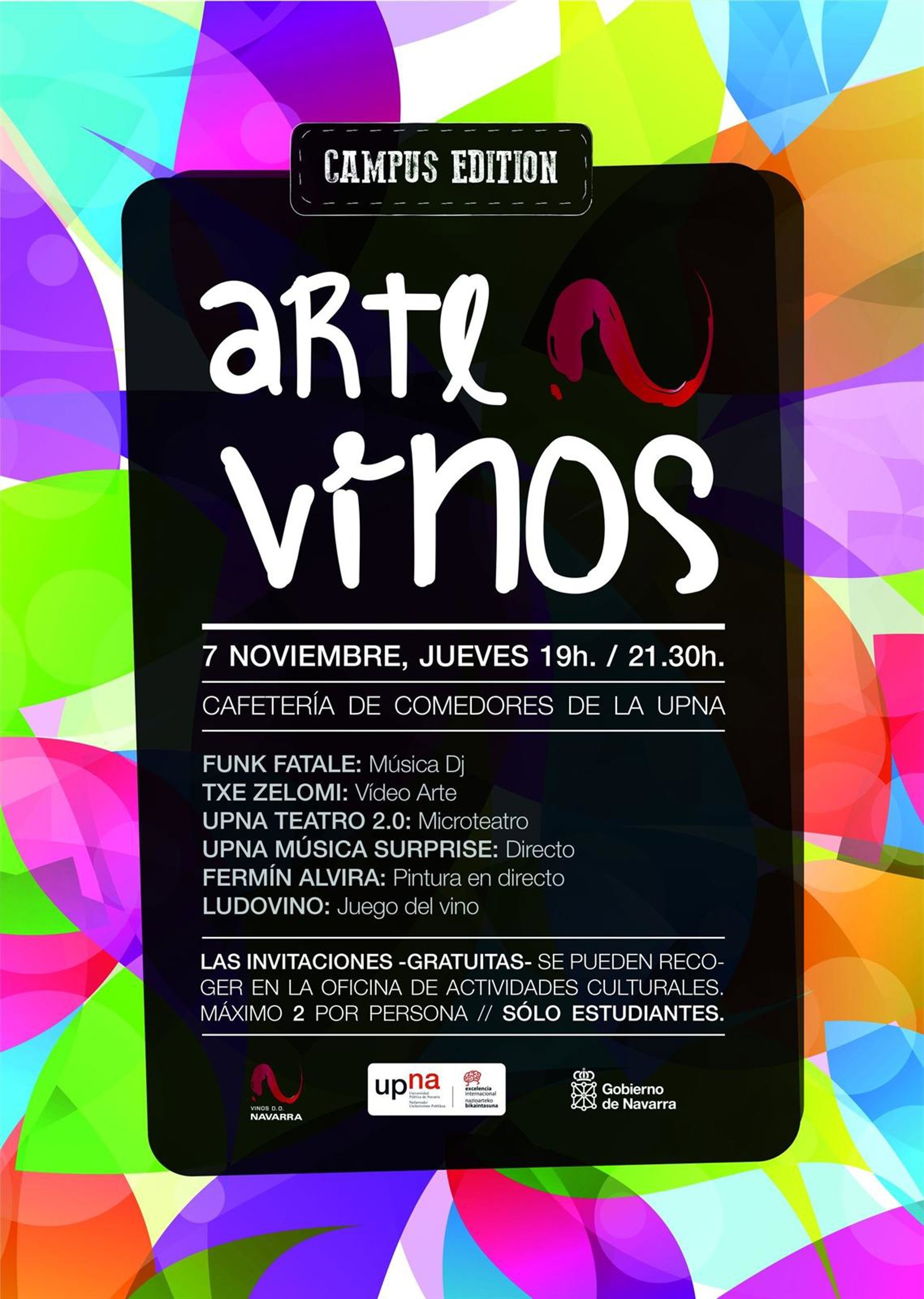 Arte N Vinos Edición Campus contará con la participación de estudiantes de la UPNA en el programa artístico. Así, el grupo UPNA Teatro 2.0. representará dos obras de 'microteatro' en espacios de uso no habitual para el público universitario. Habrá, además, una propuesta de música en directo, que sorprenderá a los asistentes.