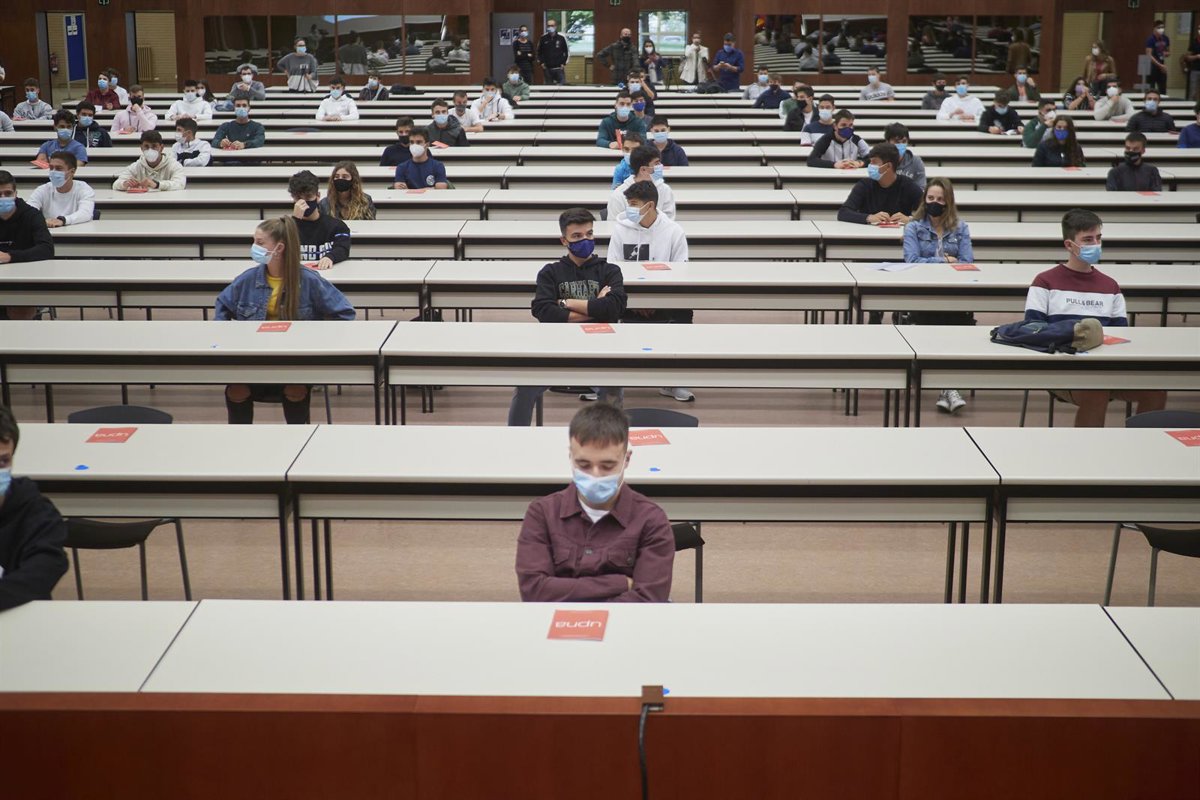 Alumnos del primer curso de grado se sientan distanciados en el Aula Mayor durante la apertura del curso 2020-2021 en la UPNA, en Pamplona, Navarra (España), a 1 de septiembre de 2020. La Universidad Pública de Navarra afronta el nuevo curso aplicando l - Eduardo Sanz - Europa Press