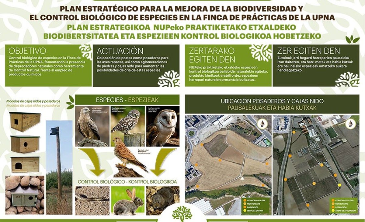 La utilización de depredadores naturales "cuenta con ventajas frente al enfoque convencional, basado en el empleo de productos químicos". Entre ellas, el fomento de la biodiversidad. Por ello, en esta iniciativa, se van a instalar posaderos y cajas nido que aumenten la presencia de especies propias de la cuenca de Pamplona.