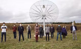 Parte del equipo impulsor del proyecto de radiotelescopio de la UPNA posa junto a la instalación - UPNA