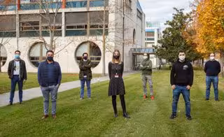 Los investigadores participantes en el proyecto BRAINSENS. De izda. A dcha. En la fila delantera: Hansel Fernández, Yaiza Álvarez e Iñigo Paños. En la fila trasera: Mikel Berástegui, Pablo Sarobe, Jesús Villadangos y José Javier Astráin. - UPNA