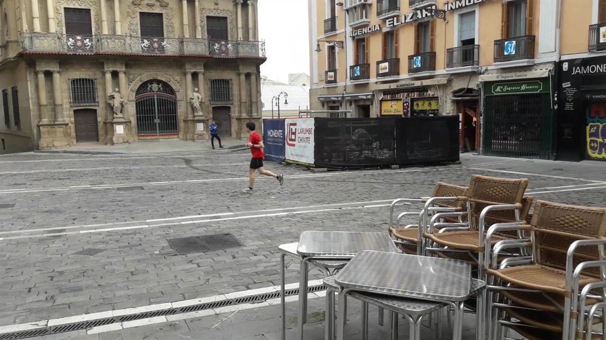 Una persona corriendo en la plaza del Ayuntamiento de Pamplona en el primer día en que se permite hacer ejercicio al aire libre - EUROPA PRESS