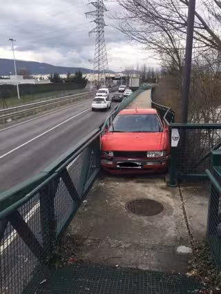Un vehículo ha quedado este miércoles empotrado en un paseo peatonal junto al río Arga en la zona del polígono industrial de Landaben en Pamplona.