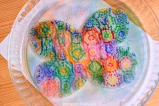 Una vez que los niños ya hayan dibujado y pintado su toalla de papel deben sumergir la toalla en agua, idealmente en un recipiente transparente cubierto de agua. A medida que la toalla de papel se moja, irán notando el arco iris de colores que se forma.