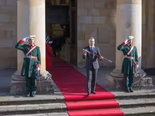 Tras ser saludado por la presidenta del Parlamento, Bakartxo Tejería, y de las Juntas Generales, Ana Otadui, así como por los miembros de la mesa de la Cámara vasca, en comitiva, han avanzado hasta el salón de plenos, escoltados por maceros de las tres diputaciones forales.