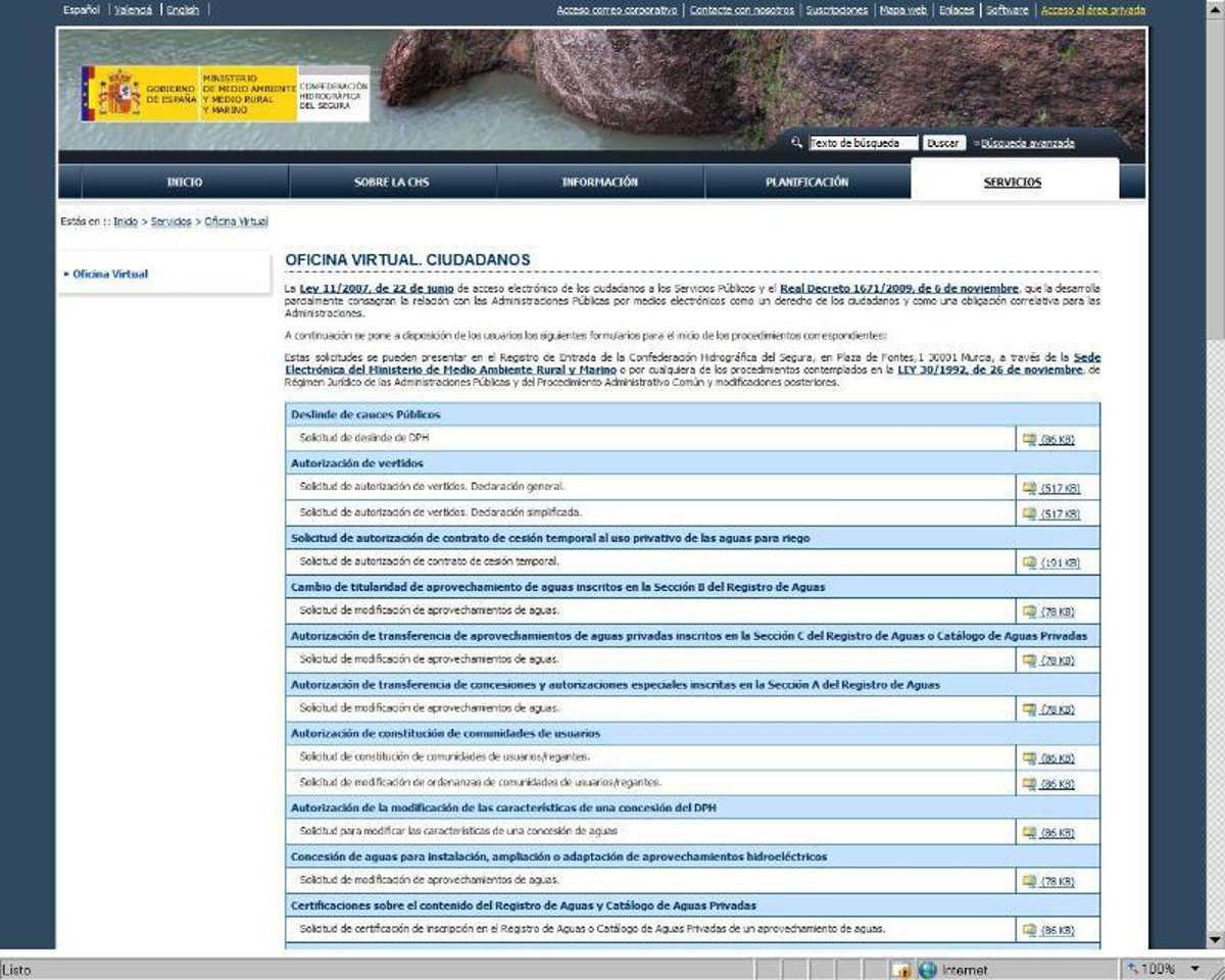 La Confederación Hidrográfica del Segura (CHS) reforzó su apuesta por las nuevas tecnologías con la Oficina Virtual, una sección de su página web que permite la descarga de 45 tipos de formularios para el inicio de procedimientos y que servirán para facilitar la tramitación de documentos, según informaron fuentes del órgano de la cuenca en un comunicado.