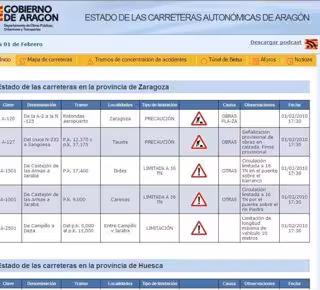 La web incluirá un mapa de Aragón con todas las carreteras de la red autonómica, de las que señalará, por ejemplo, las que estén afectadas por obras; el aforo de cada una de ellas --porcentaje de vehículos ligeros o pesados que circulan por ellas--, así como los tramos de concentración de accidentes.