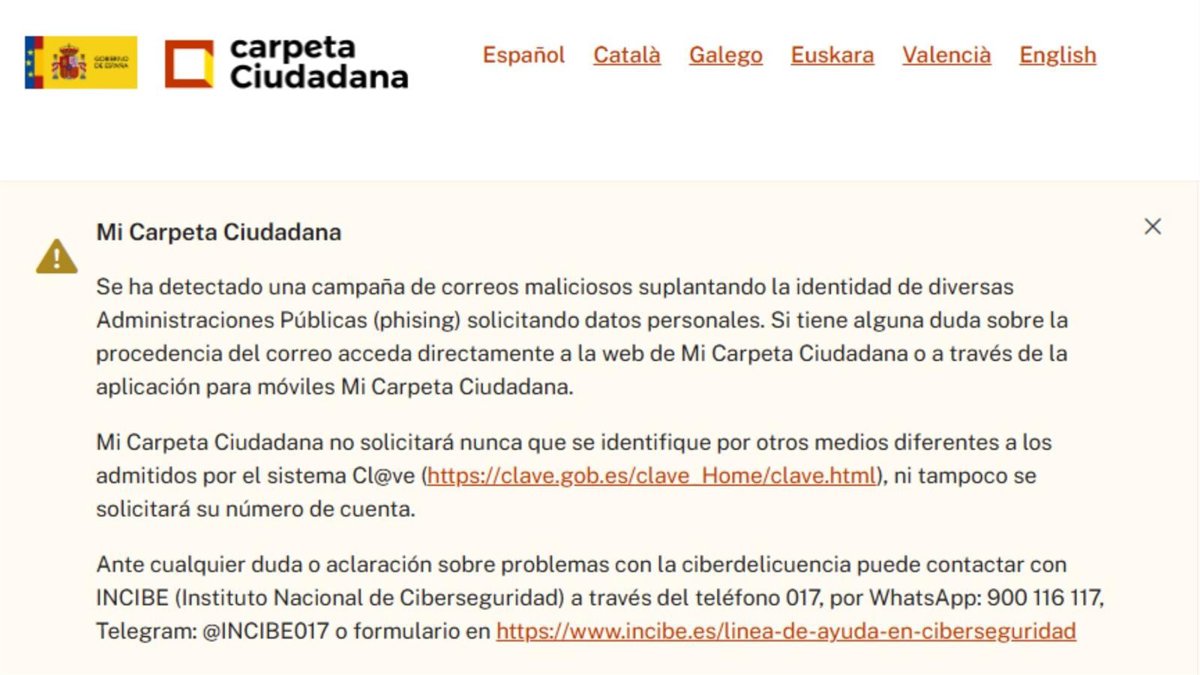 Advertencia en la web de 'Mi Carpeta Ciudadana'.