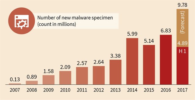 Durante el primer semestre del año, los cibercriminales alumbraron un total de 4.891.304 nuevos programas maliciosos, un 70% de todo el 'malware' creado en 2016. Esto supone más de 27.000 nuevos virus al día o uno nuevo cada 3,2 segundos. Si se mantiene este ritmo de creación, el año terminará con cerca de 10 millones de nuevas amenazas.
