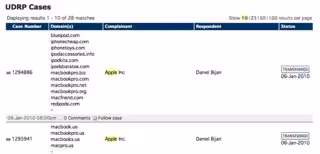 Apple ha conseguido que 16 dominios en Internet registrados a nombre de un ciudadano estadounidense pasen a su propiedad tras presentar una queja ante la ICANN (Uniform Domain-Name Dispute-Resolution Policy) al considerar que las direcciones de las páginas web hacían referencia directa a su línea de productos.