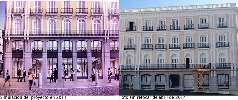 Al comparar las dos imágenes vemos cómo está actualmente la fachada de la que se prevé que sea la futura Apple Store y cómo debería de quedar después de la reforma, que se inició en abril de 2011 y cuyas obras estuvieron tres meses paradas a la espera de los permisos del Ayuntamiento madrileño. Como podemos observar en las fotos, los trabajos en este inmueble de siete plantas y 6.000 metros cuadrados edificables están ya muy avanzados.