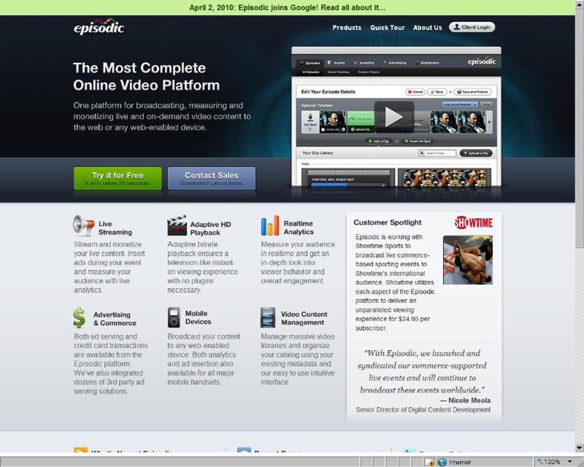 'Episodic', con sede en San Francisco, es una plataforma de vídeos orientada a empresas que permite a éstas subir sus vídeos y analizar posteriormente las visitas que han recibido y les da la posibilidad de introducir publicidad y monetizar el servicio.