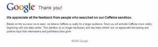 En agosto Google lanzó la versión de prueba de 'Caffeine' para recibir 'feedback' de los usuarios y en los últimos días han cerrado la página con el siguiente mensaje: "Basado en el éxito obtenido, creemos que 'Caffeine' está listo para un público más amplio. Pronto vamos a activarlo más ampliamente, comenzando con uno de nuestros centros de datos. Las pruebas ya no son necesarias y se ha retirado la página. Apreciamos las pruebas y las aportaciones positivas que los webmasters y editores nos han dado".