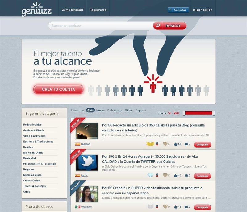 Con una tasa de desempleo que se sitúa en un 27,16 por ciento, el número de personas que trabajan desde casa ofreciendo micro-servicios ha aumentado de manera exponencial (94 por ciento) durante el último año, según la plataforma de compraventa de servicios digitales low-cost, Geniuzz. La tendencia creciente es tal, que fondos de inversión como Cabiedes & Partners y la aceleradora Mola.com han invertido en Geniuzz.
