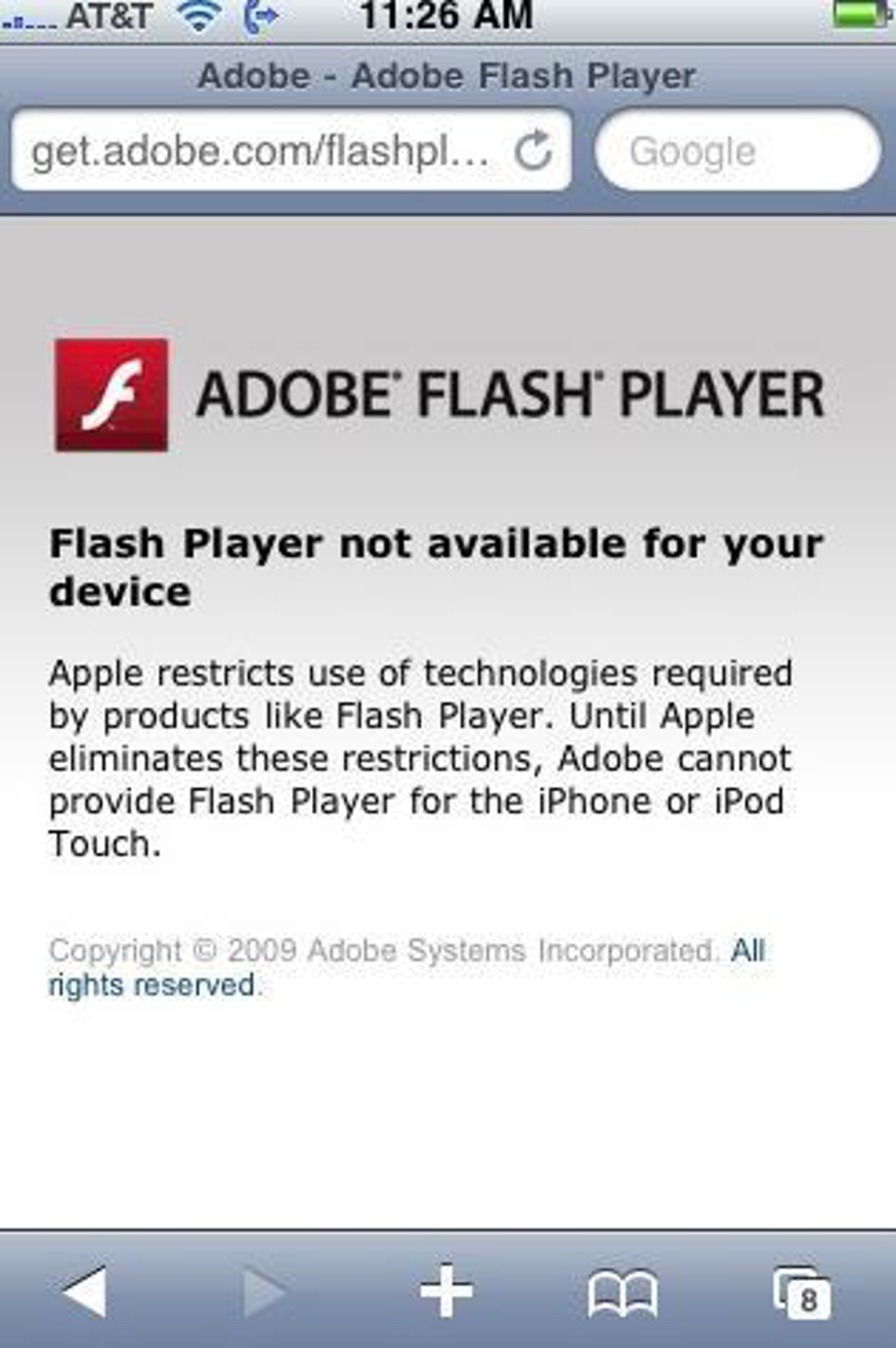 "Flash Player no es compatible con tu dispositivo", informa Adobe. "Apple restringe el uso de tecnologías requeridas por productos como Flash Player. Hasta que Apple elimine estas restricciones, Adobe no puede ofrecer Flash Player para el iPhone o iPod Touch".