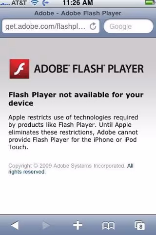 "Apple restringe el uso de tecnologías requeridas por productos como Flash Player. Hasta que Apple elimine estas restricciones, Adobe no puede ofrecer Flash Player para el iPhone o iPod Touch", reza el mensaje del 'smartphone' de Apple cuando se intenta ejecutar una aplicación bajo Flash.