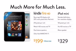 En amazon.com puede verse un anuncio del Kindle fire HD encabezado por el lema: "Mucho más por mucho menos". Justo detrás de la fotografía del Fire HD aparece la del iPad mini y a la derecha las prestaciones de cada uno. Por último al final de las especificación aparece el precio de cada uno: 199 dólares el Kindle Fire HD y 329 el iPad mini de Apple.