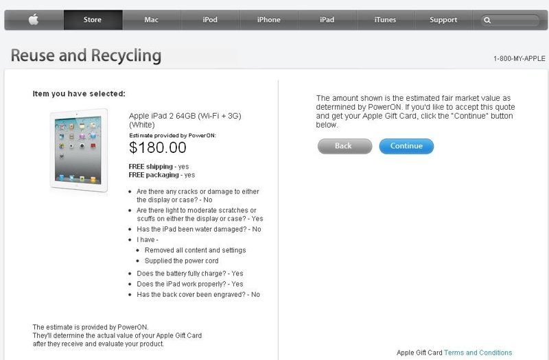 Para revender el iPad a Apple, tan solo es necesario indicar el modelo del dispositivo, iPad o iPad 2, y responder a un simple cuestionario sobre el estado del 'tablet', si tiene o no arañazos, si se le ha caído agua alguna vez o si la batería se carga completamente. Además, Apple pregunta a los usuarios si el iPad se entrega con todo el contenido eliminado y si se entrega con el cable de alimentación.