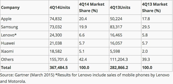 Si nos fijamos en la cifra total de terminales que han vendido las compañías durante el 2014, entonces Samsung sigue dominando con 307.600.000 de 'smartphones' vendidos y una cuota de mercado del 24,7 por ciento, frente a los 191.400.000 de Apple y una cuota del 15,4 por ciento.