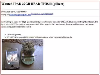 Según informó el Departamento de Policía de Gilbert, Jacob Walker publicó un anuncio en Craigslist.com indicando que quería cambiar un iPod Touch y marihuana por la nueva 'tablet' de iPad. En el anuncio el confiado vendedor incluso incluyó fotos de ambos en su anuncio.