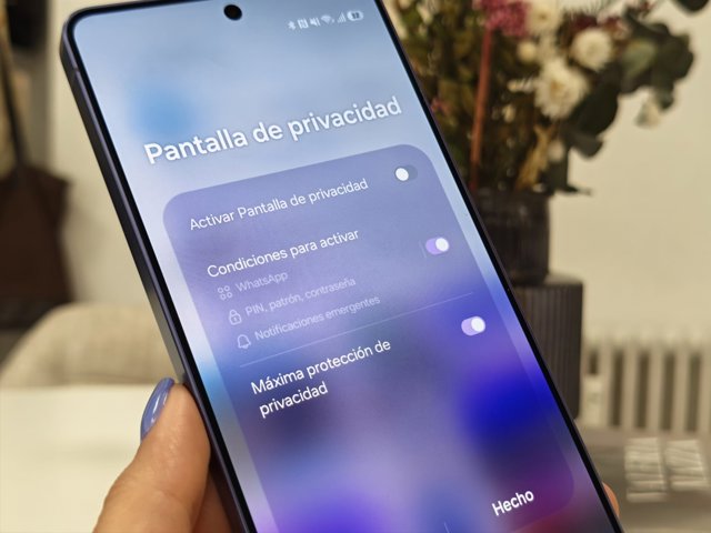 En lugar de recurrir a un filtro de privacidad de terceros, el propio panel lo lleva incorporado y, lo mejor, es que se puede activar y desactivar de forma personalizada. Es decir, se puede activar para toda la pantalla o para que funcione automáticamente al abrir aplicaciones determinadas como la del banco o de mensajería instantánea como WhatsApp.