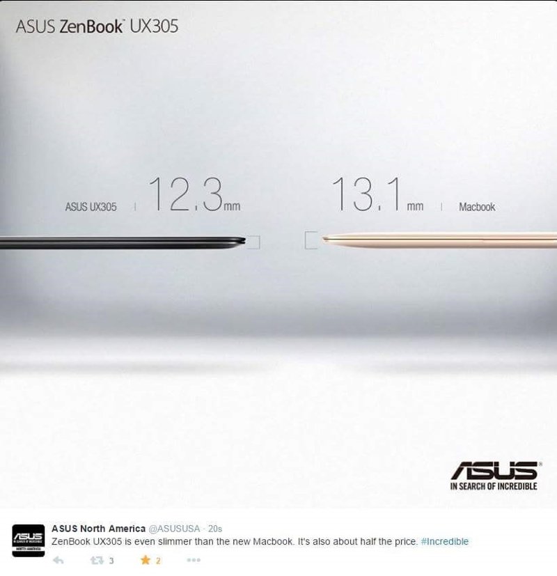 Resulta habitual que los fabricantes aprovechen la popularidad de Apple para enfrentar alguno de sus nuevos anuncios con sus productos. En este caso ha sido Asus la que ha publicado una foto comparativa de su nuevo ultrabook, el ZenBook UX305, en el que destaca su extrema delgadez.