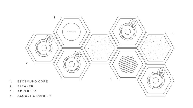 BeoSound Shape está compuesto por módulos hexagonales de altavoces, amplificadores y paneles amortiguadores del sonido que se colocan en la pared, en cualquier forma imaginable. En base a la personalización, un algoritmo diseñado por la compañía ofrecerá recomendaciones sobre la colocación óptima del máster y los altavoces dentro de la forma diseñada.