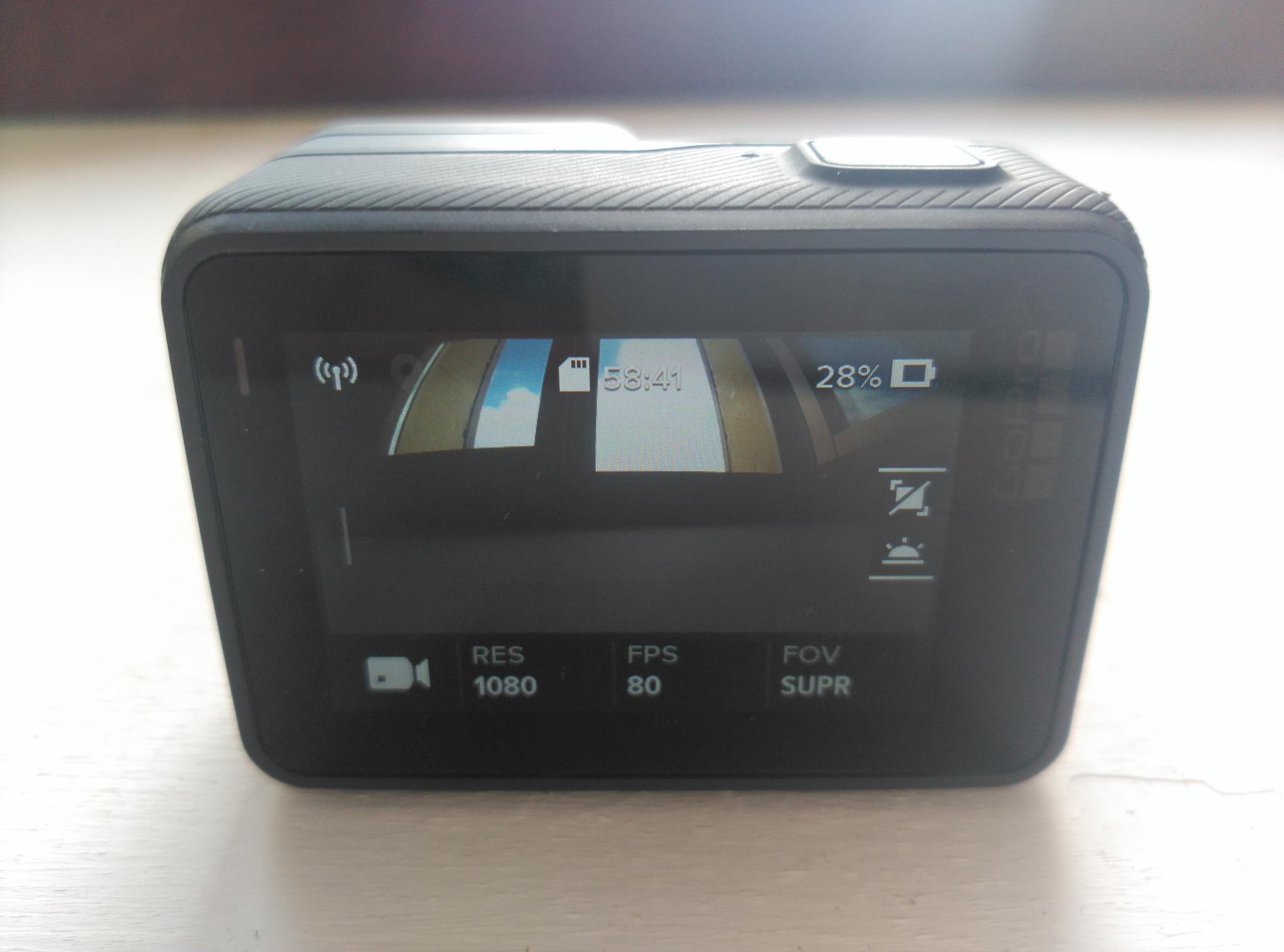 HERO5 BLACK tiene dos pantallas, y cada una ofrece distintas opciones. En la parte frontal, una pantalla más pequeña nos informa de los minutos que llevamos grabados o las características que estamos usando a la hora de hacer una foto.