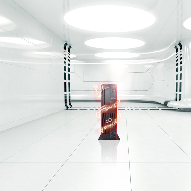 El primero de los dos ordenadores de sobremesa presentados por Fujitsu es Celsius J550/2, una estación de trabajo de solamente 10 litros. El equipo está destinado para escenarios multimonitor, soportando hasta 11. Tres de los monitores son impulsados por la tarjeta gráfica integrada en placa Intel HD Graphics P530, mientras que las otras ocho pantallas están alimentadas por dos tarjetas gráficas NVIDIA Quadro P600.