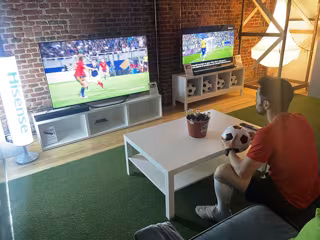 Un aficionado viendo un partido de fútbol de la selección española en el U7HQ, el televisor oficial del Mundial de Qatar 2022. - EUROPA PRESS.